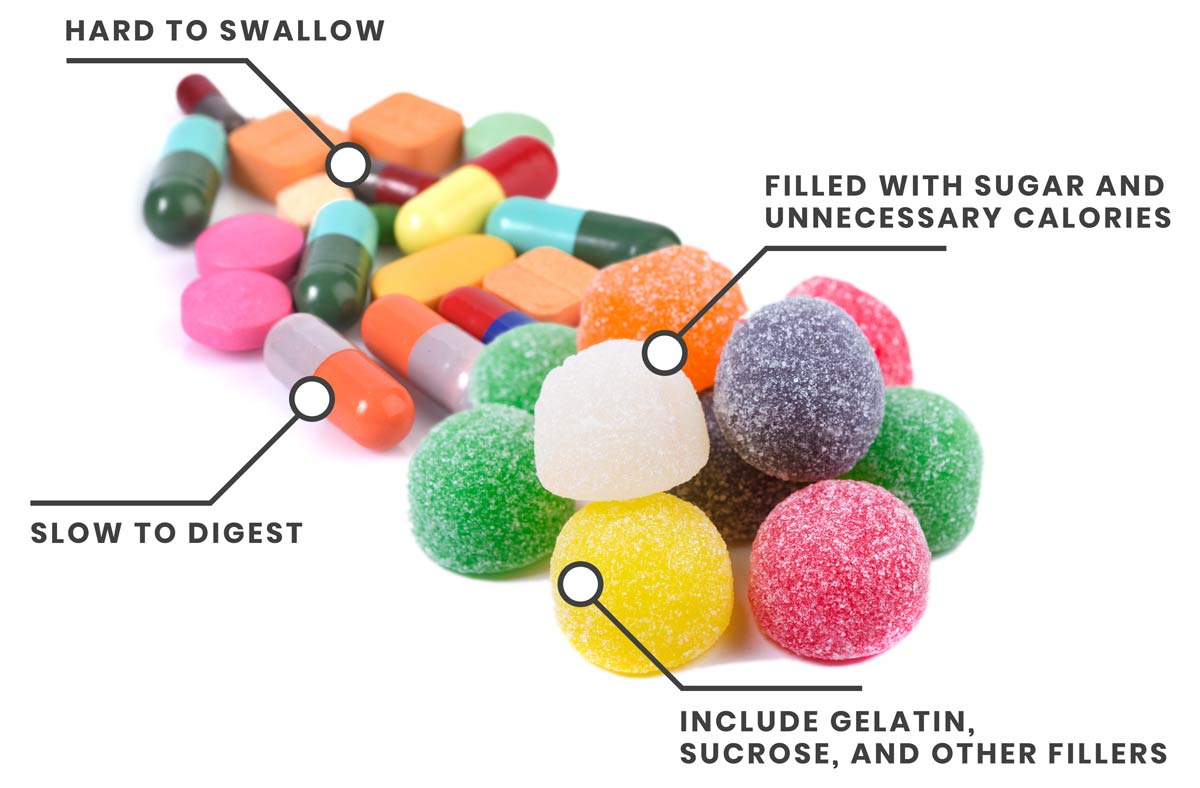 Discover a better way to take your daily vitamins! Move beyond traditional pills and gummies, which aren't as effective in delivering the nutrients you need. Plus, they often contain extra ingredients you might not know about. Explore a simpler, more effective solution for your health.